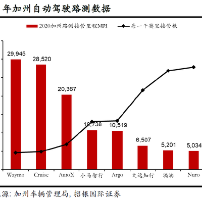 下图是 2020 年加州自动驾驶路测数据。可以看到路测里程越低的企业,每一千里接管次数越高。
