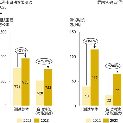 类似 32 家企业的 774 辆车获得道路测试和示范应用牌照。2023 年实现了 963.3 万公里总测试里程,其中自动驾驶功能测试 743.7 万公里。总测试时长 115 万小时,其中自动驾驶总测试时长 64 万小时。