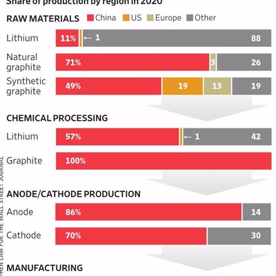 华尔街日报的一组数据,中国在 Lithium ion battery (锂离子电池)产业链的主要环节(原材料、化学处理过程、正负极材料、电池组制造)均占有大部分的份额。