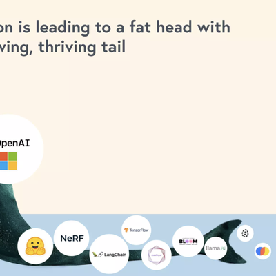 和一般的长尾不同,这条 “巨鲸” 头部异常肥大。映射了少数关键寡头似乎正在垄断这个市场的大部分开发者活动。而人工智能模型的训练成本的降低,也推动了低成本、更小或垂直化大模型的发展,虽然其生态系统要碎片化得多。