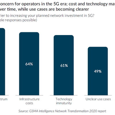 附图是 GSMA 2020 年针对全球运营商的调研,围绕 “影响 5G 网络投资的最大障碍”。