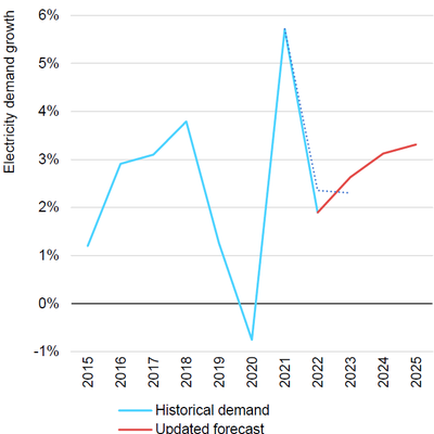 国际能源署 IEA 调整了 2022 年 7 月的预测曲线,认为全球电力需求的增长会保持上扬态势。