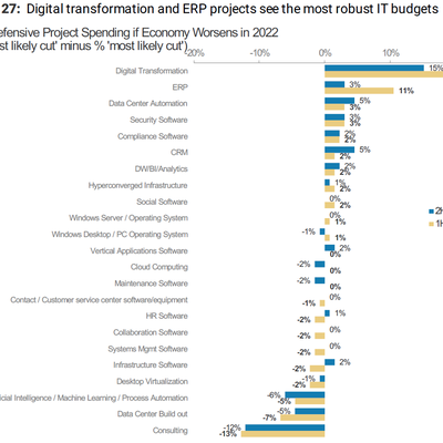 根据 AlphaWise 和 Morgan Stanley 的调研,最可能会保留的三个主题是:(1) 数字化转型、(2) ERP、(3) 数据中心自动化。