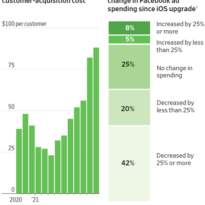 下图左侧 WSJ 绘制了某美国服务零售商(Sozy)2020 年以来平均每客户获取成本。可以看到单价呈只限上升态势。