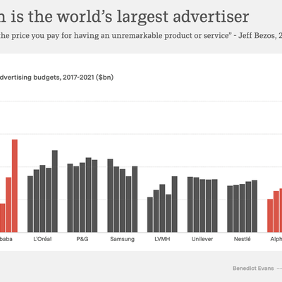 Benedict Evans 引用 AdAge 的数据,绘制了 2017-2021 年期间的全球十大广告主。