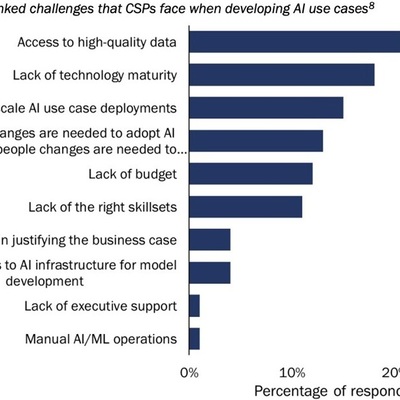 附图来自 Analysys Mason 咨询公司对运营商的调研,围绕 AI 应用案例所面临的挑战构成。