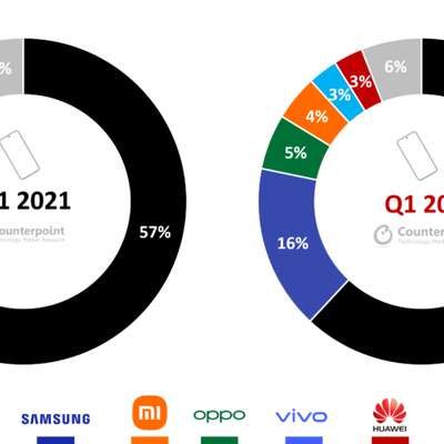 来自 Counterpoint 的数据监测,单价 400 美金及以上的高端手机(Premium)在 2022Q1 同比去年出货量下跌了 8%。但 Apple 的份额却从去年的 57% 提升到 62%。