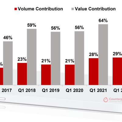 根据 Counterpoint 的定义,单价 400 美元的机型被定为高端机型(Premium)。那高端机型能贡献多少收入呢?
