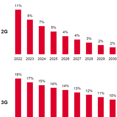 2G + 3G 之和达到了 29%(2022 年)。GSMA 预计到 2030 年两者会收缩到 12%。