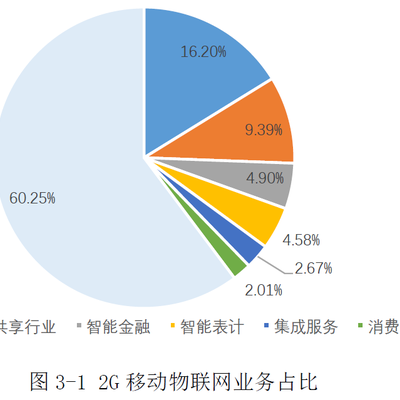 附图来自中国移动研究院的研究,国内 2G 移动物联网前六类业务场景为:(1) 车联网;(2) 共享行业;(3) 智能金融;(4) 智能表计;(5) 集成服务;(6) 消费电子。