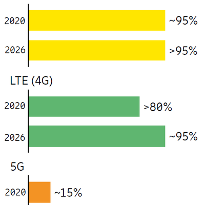 爱立信预计到 2026 年 4G LTE 覆盖率可达到 95% 以上,5G 人口覆盖率可到达 60% 以上。