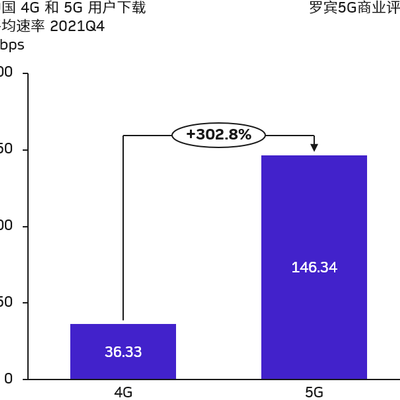 2021Q4,中国 4G 用户下载平均速率为 36.33 Mbps,5G 用户下载速率为 146.34 Mbps。