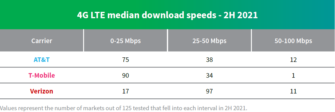 4G LTE 网络,Verzion 的测试数据最好,大部分区域的速率在 25~50 Mbps 区间,而 AT&T 和 T-Mobile 的速率大多在 0~25 Mbps。