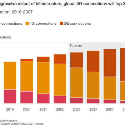 随着 5G 的规模上量,GSMA 预计 2023 年将是 4G 连接数最高的一年(50.8 亿户),然后就开始进行下行通道。