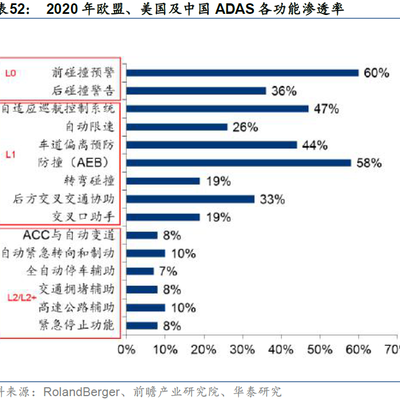 对比而言,相对初级的 ADAS(高级驾驶辅助系统)在汽车上的规模应用更为接地气一些。附图来自罗兰贝格咨询和华泰证券的研究,可以看到自动驾驶 L3 的部分功能在 2025 年会有小比例的车辆落地。