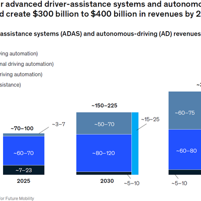 Mckinsey 研究认为到 2025 年,全球乘用车 ADAS 和自动驾驶的收入可达 700-1,000 亿美元。预计到 2035 年会增长到 3,000-4,000 亿美元的体量