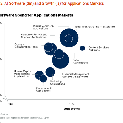 Gartner 预测全球 AI 软件应用的支出将在 2027 年达到 2,970 亿美元,附图是主要方向的增长率情况。