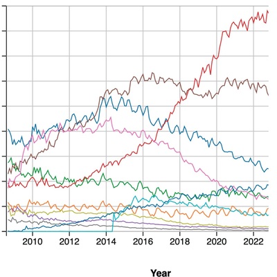 附图是知名软件开发者论坛 Stack Overflow 按问题设计的编程语言类型的百分比统计,Python 和 PHP 位居前两位。