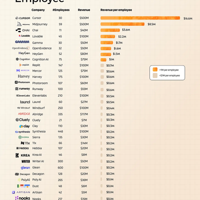 附图是 Rule of Thumb with Palle Broe 根据公开披露信息对 AI Agent 公司的排名,人均百万美金 ARR 的公司有八家,分别是:Cursor、Midjourney、Chai、Lovable、Gamma、OpenEvidence、HeyGen 和 Cognition AI。