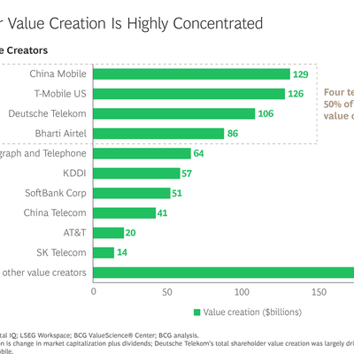 BCG 研究显示,全球 73 家上市大型运营商在 2020 - 2024 年增加了 8,800 亿美元股东价值。这其中有一半来自四家运营商分别是:中国移动、T-Mobile US、德国电信、印度 Bharti Airtel。