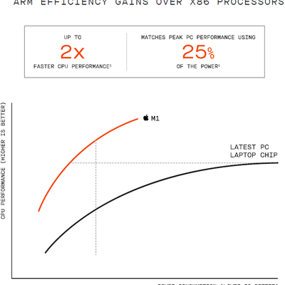 M1 是基于 ARM 指令集开发,继承了 ARM 能耗方面的优势。技术型投资银行 GP Bullhound 认为同等能耗情况下,Apple M1 芯片的性能是 x86 处理器的两倍。
