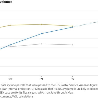 Amazon 预计 2023 将配送 59 亿个包裹,超过 UPS 2022 年的 53 个和 FedEx 的 33 亿个,而预计后面这两家物流巨头在 2023 年的包裹数会下滑。