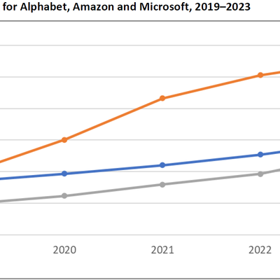 2019 年三家的投入还在 500 ~1,000 亿区间。2023 Amazon 超过了 2500 亿美元,Alphabet 和 Microsoft 也在靠近 1,500 亿美元。
