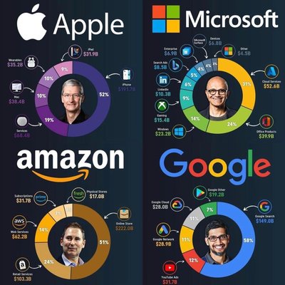 实际上,以 Apple、Amazon 和 Google 为例,最主力的那个产品线贡献了整个公司 50% 以上收入;而 Microsoft 的前三个产品线贡献了 69% 的收入。