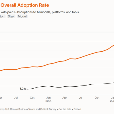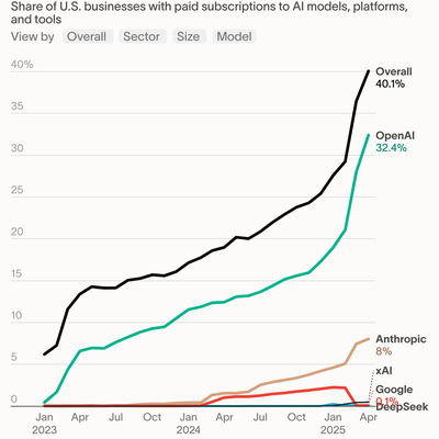 Ramp 调研数据显示,在是否为 AI 模型、平台或应用工具付费方面,美国企业的付费渗透率在 2025 年 4 月达到了 40.1%。