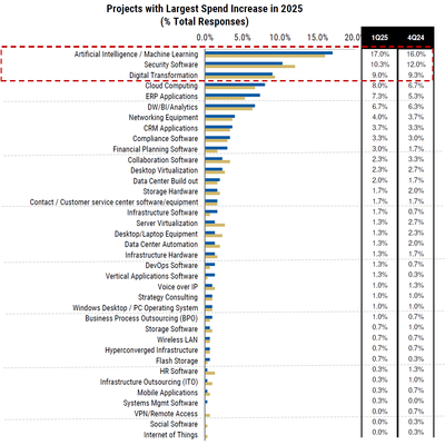 Morgan Stanley 针对北美和欧洲企业的 2025Q1 CIO 调研显示: