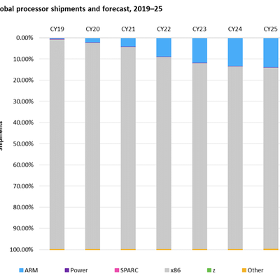 根据 OMDIA 的研究,预计在 2023 年 ARM 处理器的出货量将超过 10% (大型公有云服务商)。