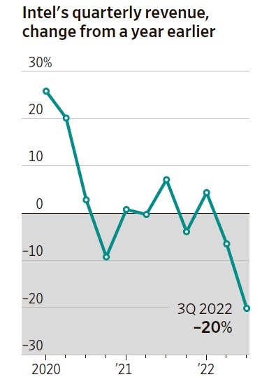 Intel 有一半的收入来自 PC 的芯片,营收自然受到很严重的影响,2022Q3 收入同比下降 20%。