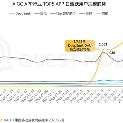 QuestMobile 的数据监测显示,DeepSeek 的日活跃用户在1月28日首次超越豆包,随后在2月1日突破 3,000 万大关。