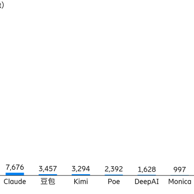 ChatGPT 遥遥领先,DeepSeek 异军突起。以 Claude、豆包和 Kimi 三者的中间值 5,000 万 Visit 计算,ChatGPT 是这个中间值的 77x 倍,高了两个数量级。