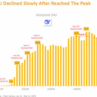 QuestMobile 监测数据显示,DeepSeek 的日活跃用户(DAU)在2025 年 2 月底实现 5,340 万用户后,逐渐回稳,整体在 4,500 万左右。