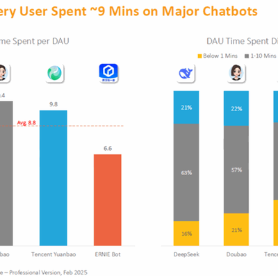 QuestMobile 监测数据显示,中国头部 AI 会话工具的用户日均使用时长评价值为 8.8 分钟。