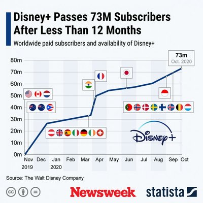 附图是迪士尼在全球各地的上线过程,12个月时间从零发展到 7300 万付费用户。