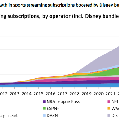 不过这一形势正在发生变化,体育流媒体服务已从 2010 年 280 万订阅增长到 2020 年 2,380 万。大约 40% 的流媒体订阅来自 Disney+ /Hulu/ESPN+ 捆绑。