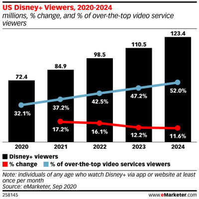 eMarketer 预测 2020 年 Disney+ 会达到了 7,240万用户,并在未来几年保持在两位数的增幅。最终在 2024 年达到 1.23亿户。