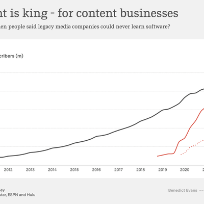 从美国流媒体市场的发展近况看,这个观点未必站得住脚。Benedict Evans 对比了 Netflix 和 Disney 的流媒体用户发展情况。