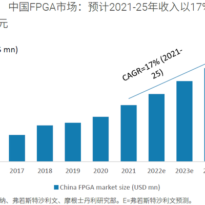 Morgan Stanley 预测中国的 FPGA 2021-25 年收入以 17% 的 CAGR 增至 52亿美元。