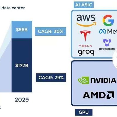 预计 2029 年 GPU 市场空间会提升到 1720 亿美元,CAGR 29%。AI ASIC 会提升到 560 亿美元,CAGR 30%。