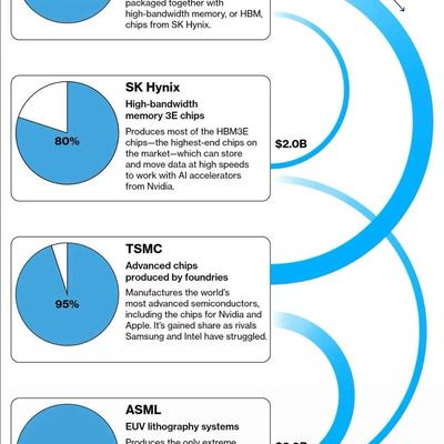 Bloomberg 绘制了一张图,展示了 AI 芯片的四家关键公司(Nvidia、SK Hynix、TSMC 和 ASML)各自的份额以及在供应链上下游关系。