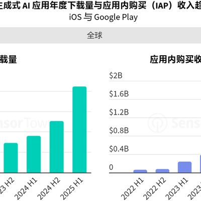 Sensor Tower 监测数据显示,2025H1 全球生成式 AI 应用(涵盖 AI 助手和 AI 内容生成器)的下载量接近 17 亿次,应用内购买(IAP)收入高达近 19 亿美元。消费者在 2025H1的支出对比 2024H2 增长了一倍。