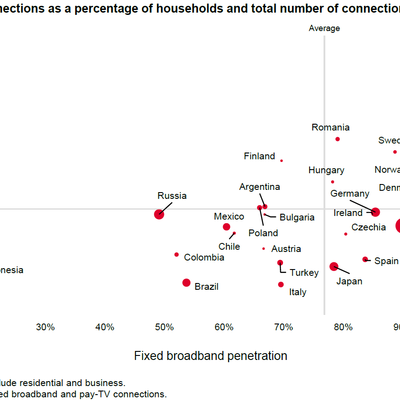 GSMA 绘制了一个矩阵,横轴是各地区固定宽带的渗透率,纵轴是付费电视的渗透率。