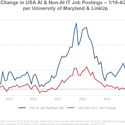 University of Maryland 和 LinkUp 的研究显示,如果以 2018 年 1 月发布的 IT 工作招聘启示数量作为基点,到 2025 年 4 月,美国 AI 类岗位的招聘启示增长了 448%,而非 AI 类岗位的招聘启示则下降 9%。