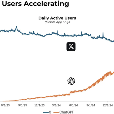 Sensor Tower 数据监测显示,ChatGPT 的移动端 APP 日活跃用户 DAU 用户数在 2025 年 6 月份已经超过 Twitter(X)。