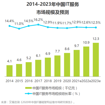 艾瑞咨询的研究表明,中国 IT 服务在过去及未来几年均会保持两位数的收入增长。