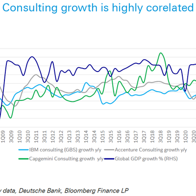 咨询服务属于一种经典的现代服务业,和市场经济发展有多大关系呢?德银(Deutsche Bank)的一项研究,其把 IBM Consulting、Accenture Consulting 和 Capgemini Consulting 的增长数据和全球 GDP 的增幅放在一起。