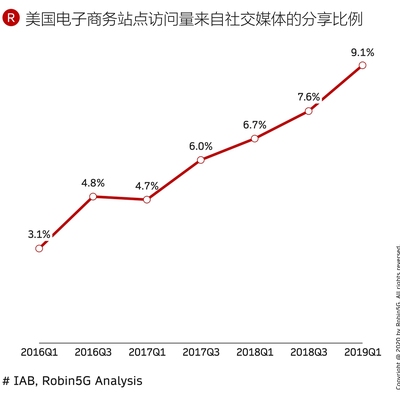 美国电子商务所有访问流量中,来自社交媒体的分享链接比例持续增加,从 3.1%(2016Q1) 增长到 9.1%(2019Q1)。